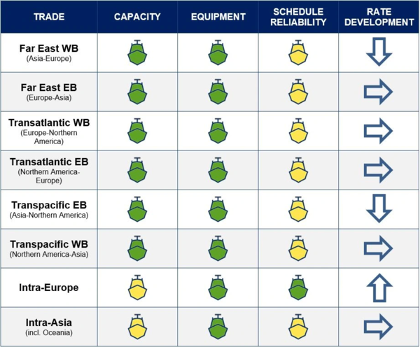 Legend: traffic lights showing current status, arrow indicates possible development of transport rates.